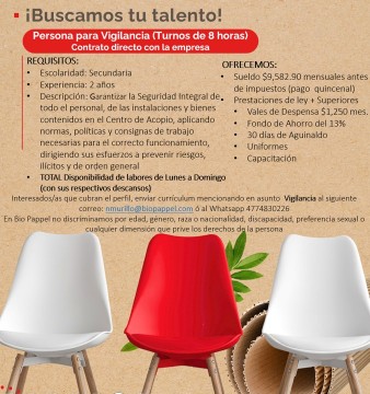 Interesados que cubran el perfil, enviar currículum mencionando en asunto Vigilancia al siguiente correo: *******@****.com ó acudir con solicitud elaborada a Blvd. Timoteo Lozano #2135 Col. San José de Cementos, CP 37555, León Guanajuato ó agendar entrevista al whatsapp (***)-***-****226.